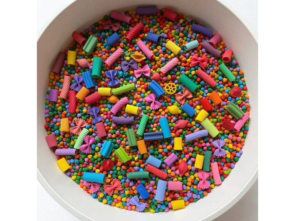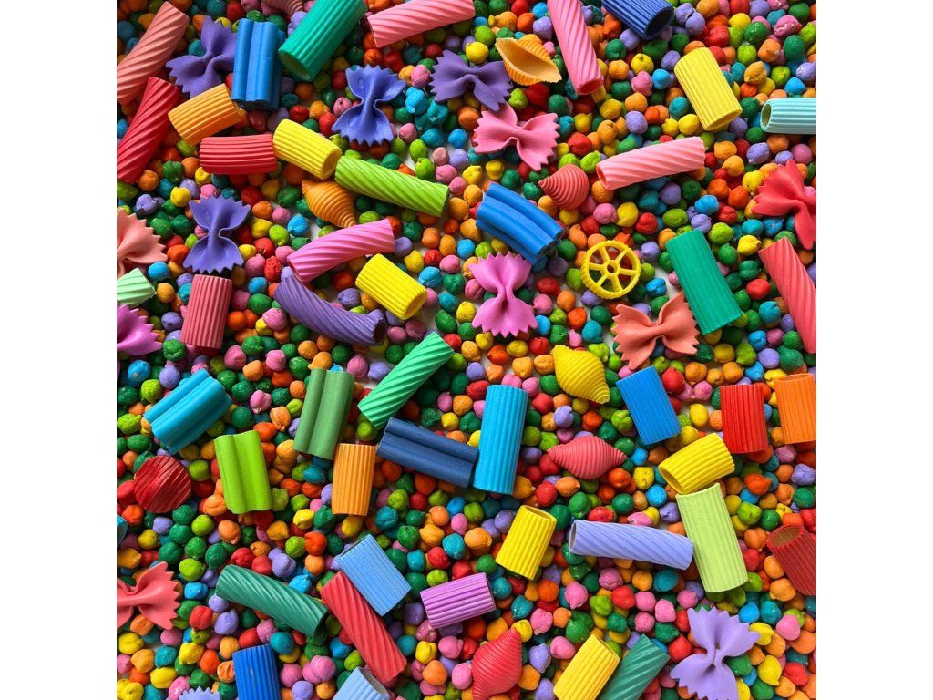 Složení mixu: cizrna (netoxické akrylové barvy), těstoviny (netoxické akrylové barvy)