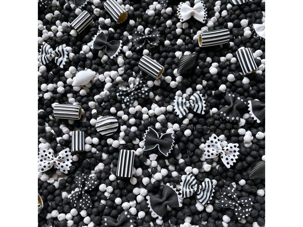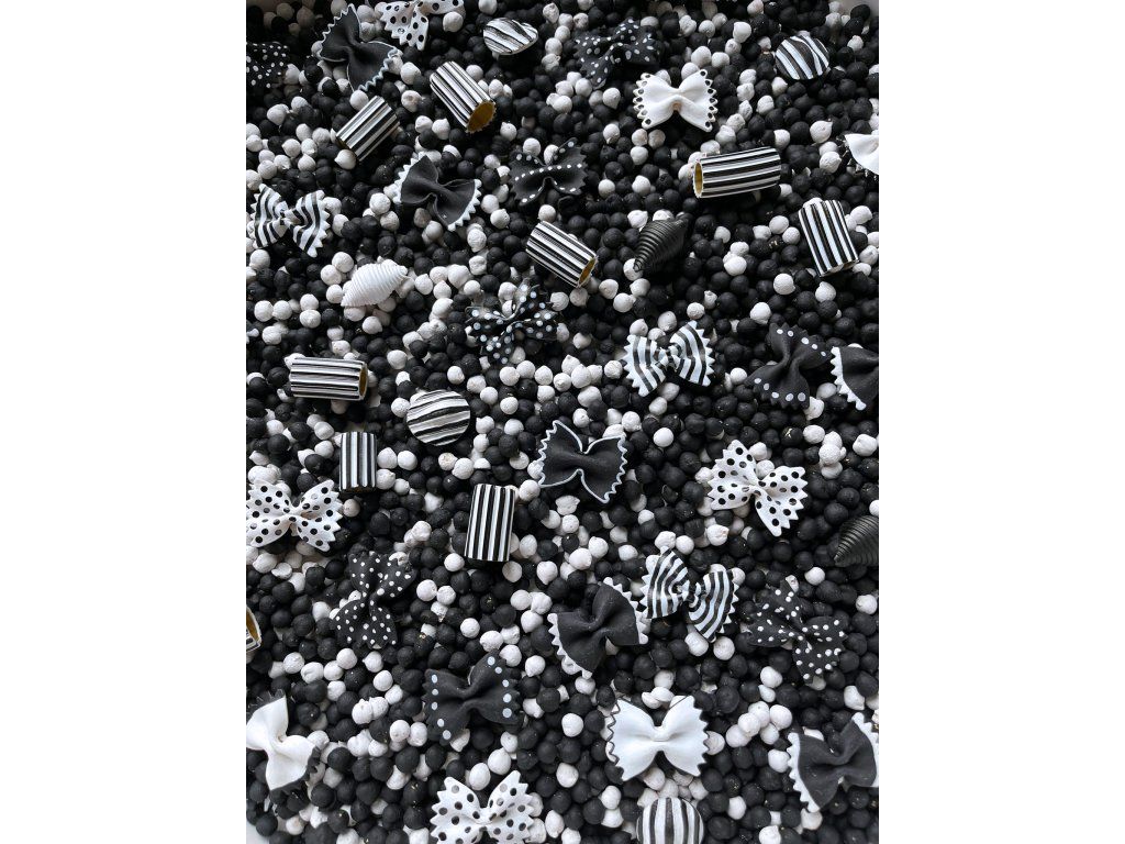 Složení mixu: cizrna (netoxické akrylové barvy), těstoviny (netoxické akrylové barvy)