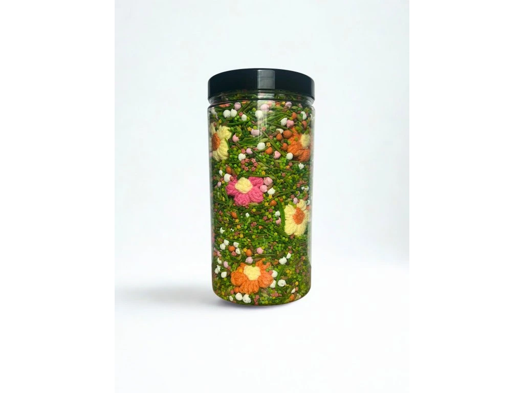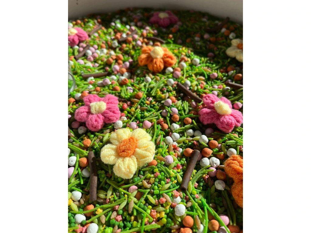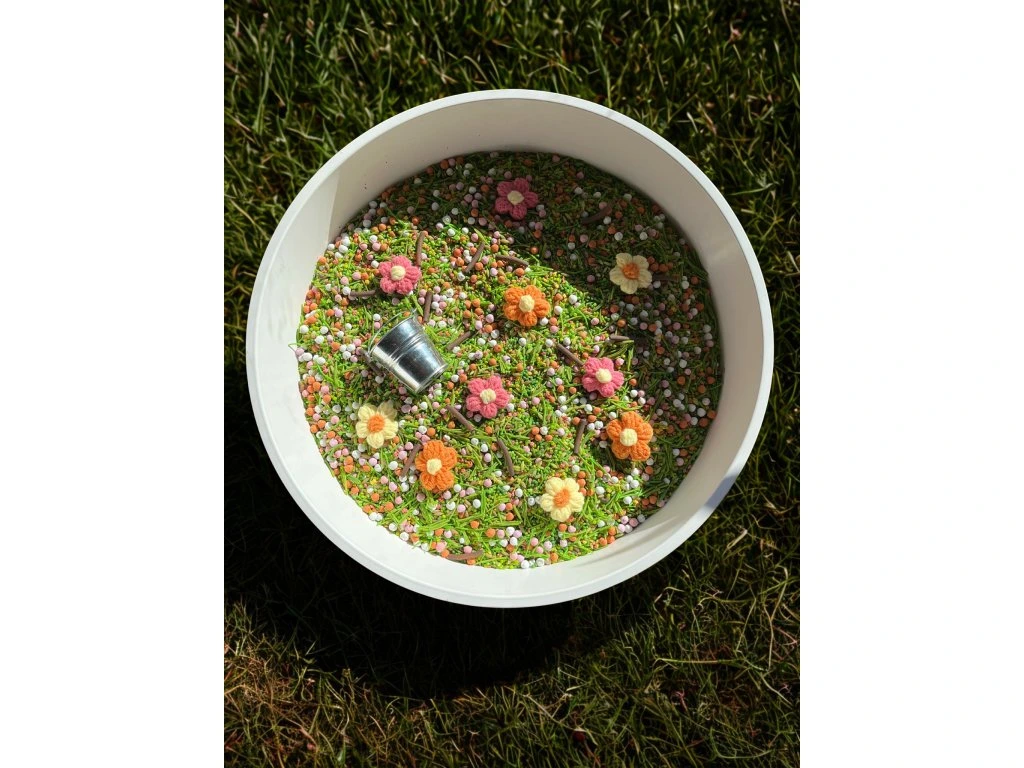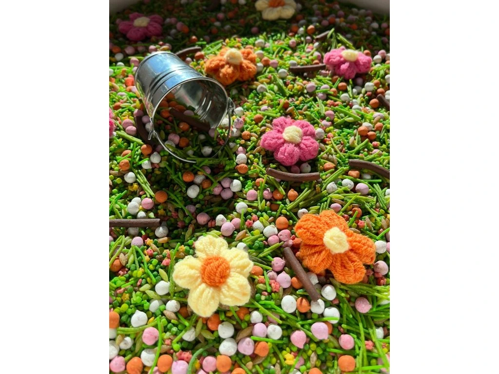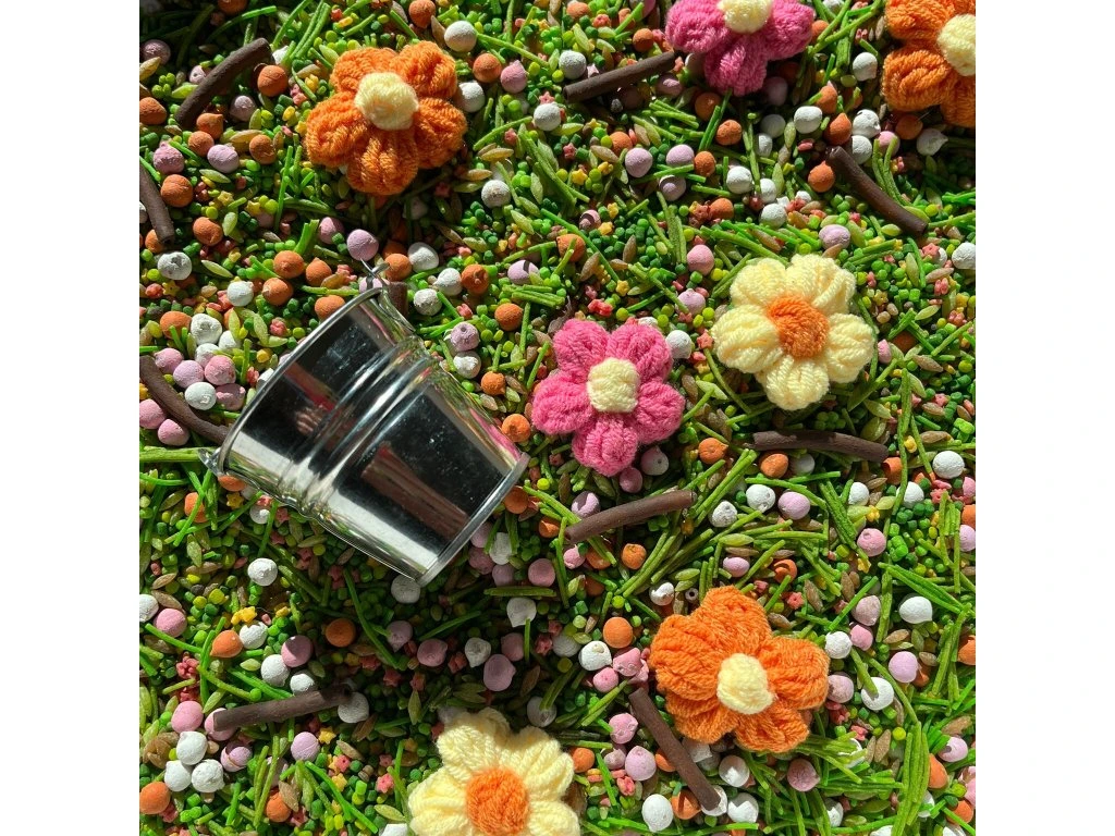 Rozkvetlý mix, který vás přenese na prosluněnou louku či zahradu! Součástí mixu jsou i pletené bavlněné kytičky (abychom minimalizovali plasty v našich výrobcích) a kovový kyblíček. Oboje věci, které využijete ještě dlouho po tom, co vám senzorický mix už doslouží.