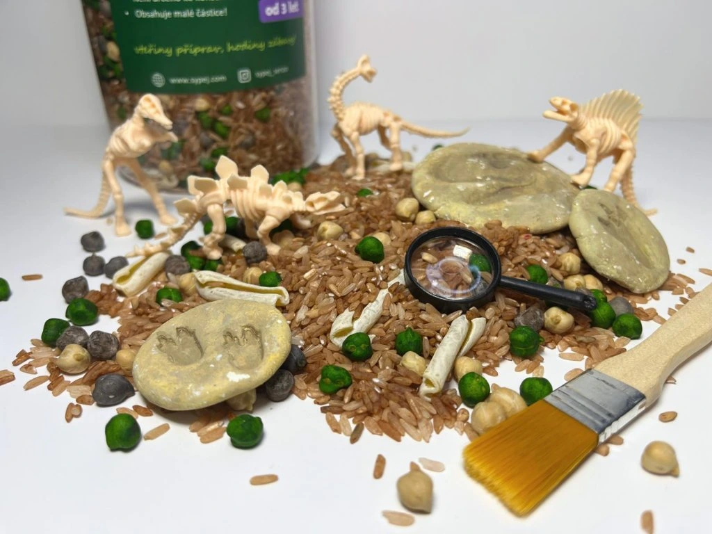 Každý milovník dinosaurů a pradávné historie si přijde na své s mixem PALEO! Jedná se o směs rýže, cizrny, těstovin, fosilií z modelovací hmoty, 5 gumových figurek koster dinosaurů a doplňků jako štěteček a mini lupa. Zkrátka všeho, co by mohl budoucí paleontolog potřebovat.