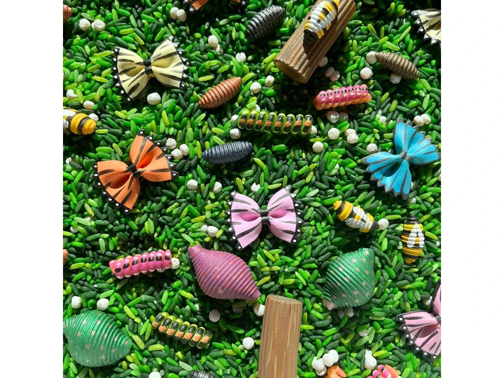 Tento senzorický mix vašim dětem přiblíží život těch nejmenších tvorů, které mohou pozorovat v trávě ať už na louce nebo na zahradě. Základ mixu je jednoduchý a hezky sypký (rýže v několika odstínech zelené a bílé kuličky tarhoni pro oživění) tak, aby dětem umožnil objevování skrytého hmyzu.