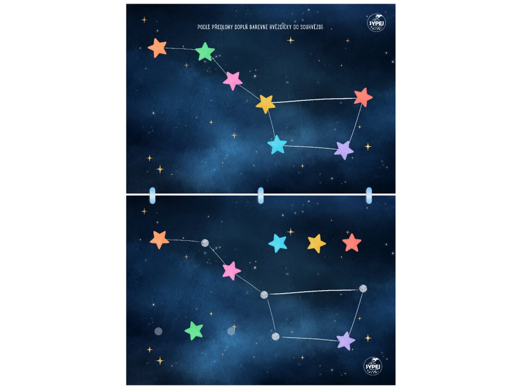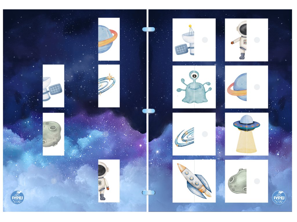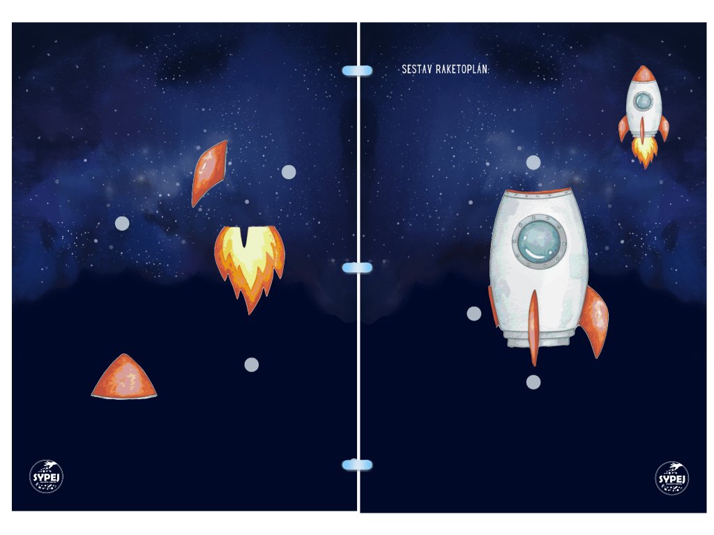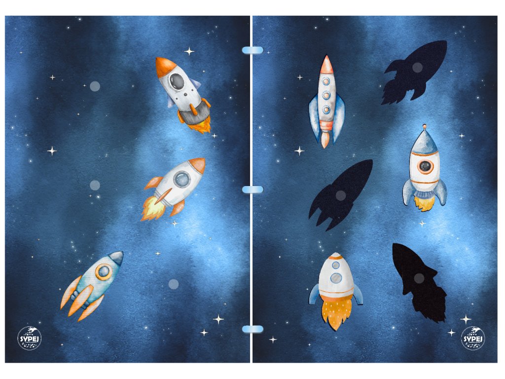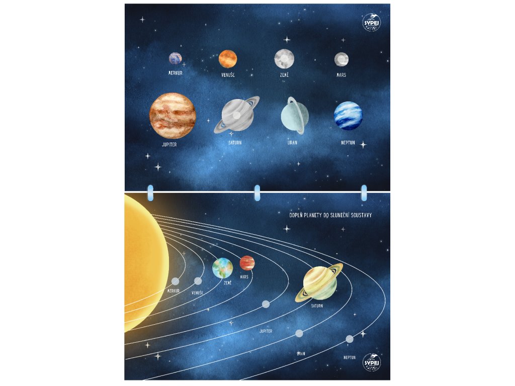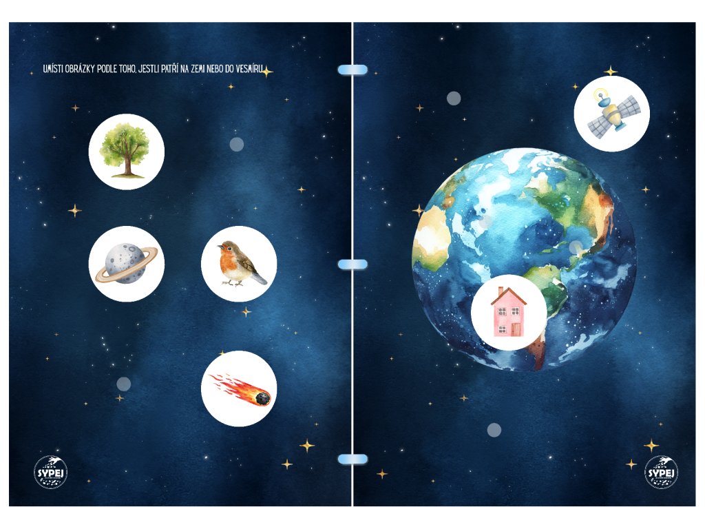 Interaktivní sešit plný VESMÍRU Sešit formátu A4 obsahuje 11 různých cvičení na téma u dětí velmi oblíbené - a tak mohou sestavit raketoplán, seřadit planety sluneční soustavy, podle barev přiřadit mimozemšťany nebo hvězdy do souhvězdí, seřadit planety podle velikosti, pomoci astronautovi najít cestu domů... A ještě mnohem víc!